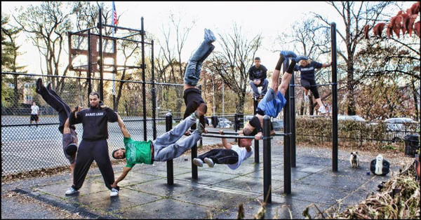 It seems pedantic to describe bodyweight exercises. Lately, a serious army dedicated to using solely themselves as implements of physical change has started marching, and growing almost daily. If you want to see how you can strengthen and shape your body with just it’s own weight, and do some really cool moves, Google Al Kavadlo and/or the Barstarzz. Calisthenics (from the Greek, Kalos Sthenos, beautiful strength) can be performed anywhere, and there’s more to it than simply push-ups, pull-ups, and squats. Some moves, such as handstands, levers, and hangs, like the human flag, are better learned by practicing than by counting reps and sets, creating a relaxed atmosphere of steady accomplishment that nourishes enthusiasm.